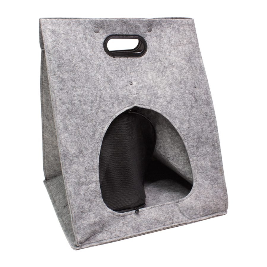 Bolso de Fieltro para transportar mascotas pequeñas (gatos, perros de razas pequeñas). Tela Fieltro Poliéster 450g/m2. Capacidad 40 litros, tamaño 40 x 52 x 40 cm. Incluye asas reforzadas de plástico negro, 2 broches de cierre superior, cubierta rígida reforzada para la base del bolso y ventana de malla negra removible, con cierre-eclair .
