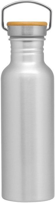 Botella de aluminio. Funcionalidad Antiderrame. Tapa metálica con detalles en bambú y manija de acero para ser transportada. Interior de la tapa en plástico con anillo de silicona antiderrame. Medidas: 7,3 x 24 cm. Capacidad: 750 ml.