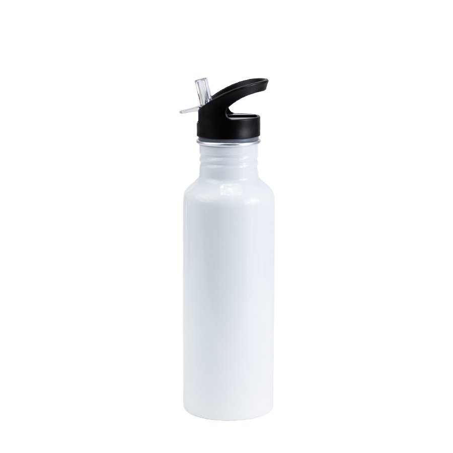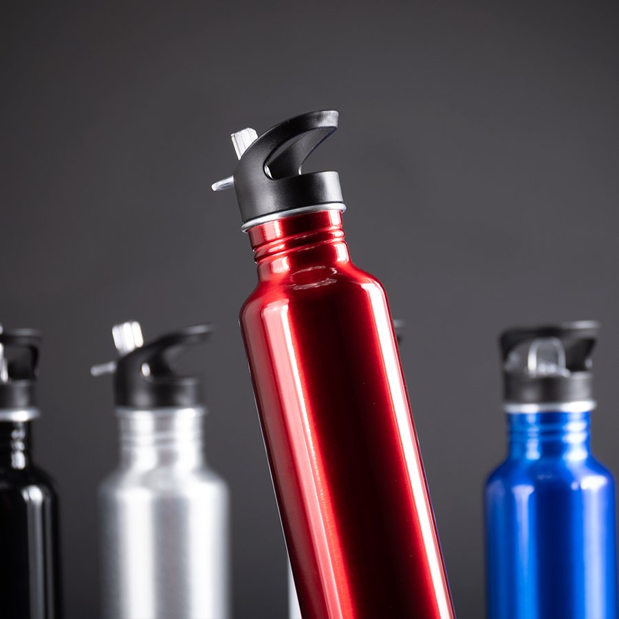 Sport Bottle botella metálica de Aluminio modelo BUZZ, con tapa rosca de plástico PP, dosificador retraíble con boquilla translúcida y anillo de silicona, anti-derrame. Producto BPA FREE, para el contacto con líquidos y alimentos. Capacidad 750ml. Presentación en bolsa PP + caja de regalo de cartón lacado color plata.