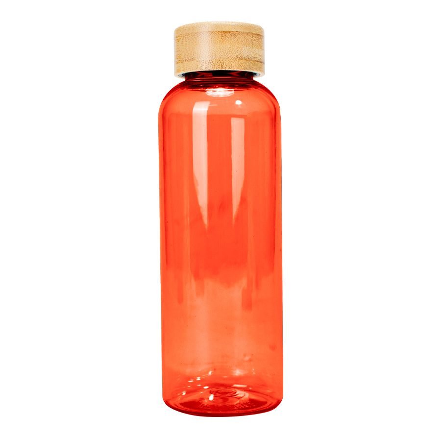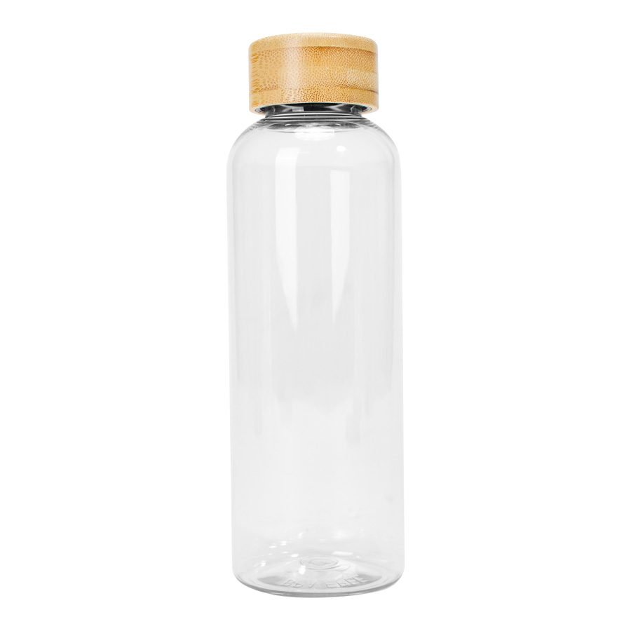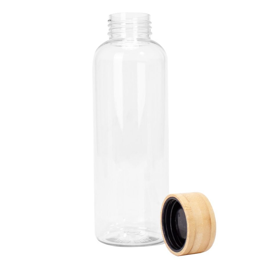 Botella plástica PET color translúcido, con tapa redonda twist-off de Bamboo, modelo «AINOA». Producto BPA FREE, para el contacto con líquidos y alimentos. Capacidad 550ml. Presentación en bolsa OPP + caja de regalo de cartón kraft.