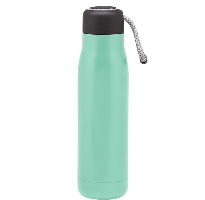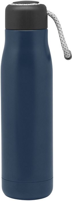 Botella térmica . Ø 7cm x 25.5 cm. Capacidad 500 ml. Acero inoxidable. Botella doble pared, sellada al vacío. Interior de acero 304 y exterior de acero 201. Tapa plástica PP + Anillo de silicona antigoteo. Posee además tira de color gris de 12 cm de largo. Ideal para llevarla a todos lados. Mantiene hasta 12 hs la temperatura de las bebidas calientes y 24 hs de las bebidas frías. Presentación en caja de regalo Kraft.