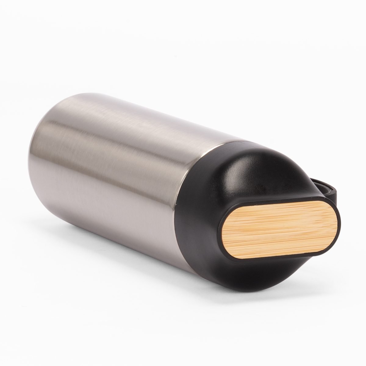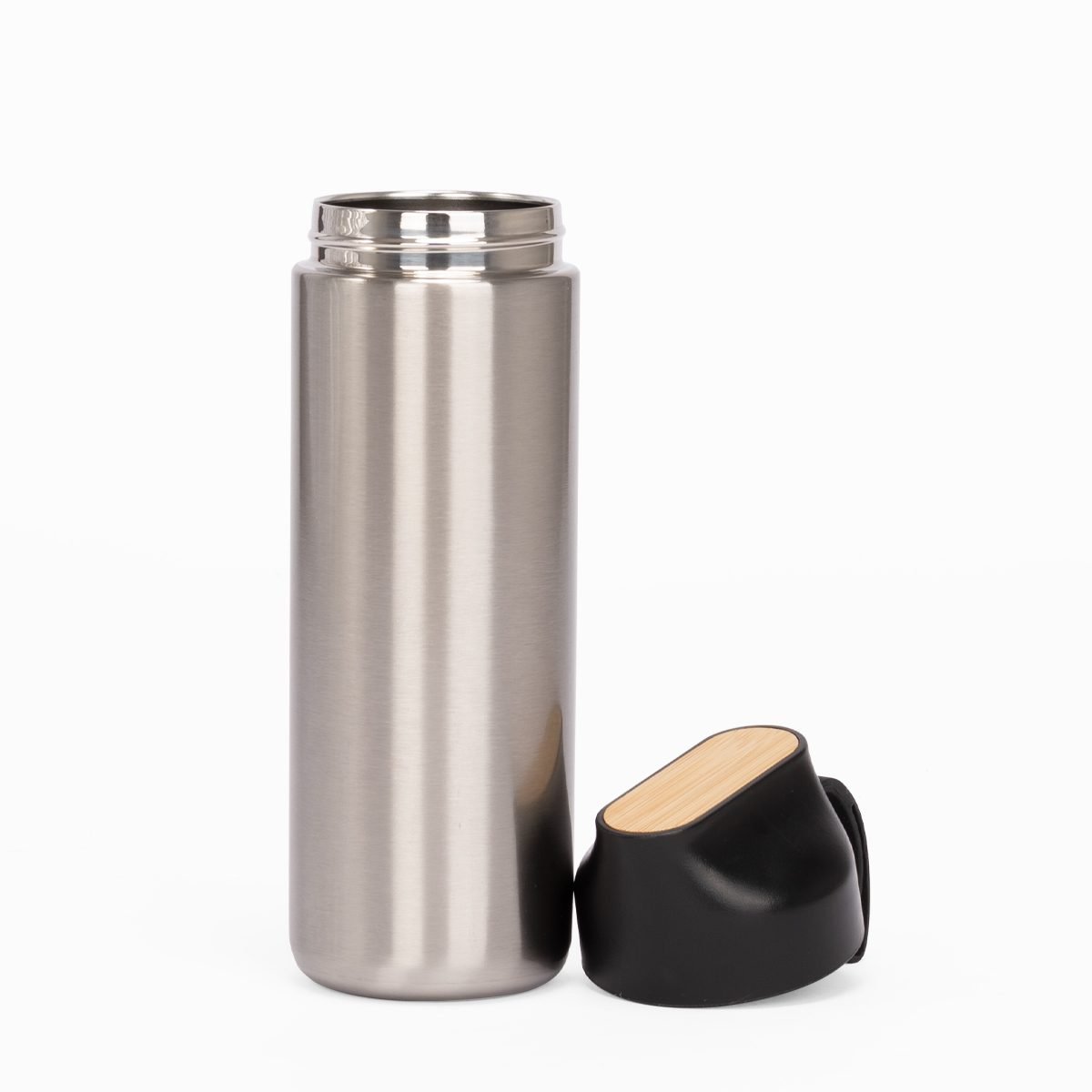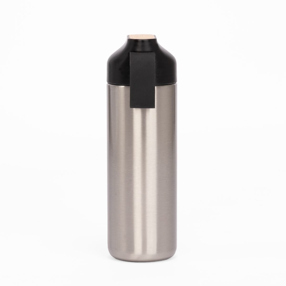 OJAI es una botella térmica de 600 ml que une resistencia, elegancia y compromiso ambiental. Fabricada en acero inoxidable reciclado con aislamiento de doble pared, mantiene tus bebidas frías o calientes por más tiempo, acompañándote en cada paso del día. Su tapa de plástico negro con detalle de bambú y asa de silicona añade un toque natural y funcional al diseño.