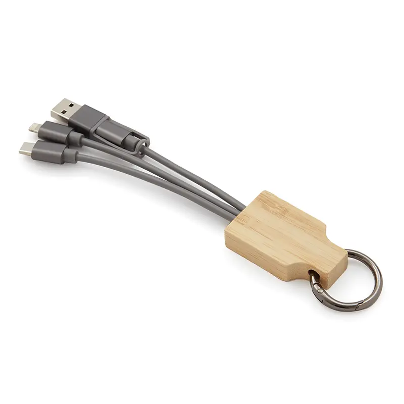 Cable 3 en 1 color gris, con una longitud de 12 cm. Incluye cable de entrada TIPO C con adaptador USB A y 2 cables de salida MICRO B / LIGHTING, lo que te permite cargar dispositivos con diferentes tipos de entradas. Cuenta con un accesorio rectangular de bamboo de donde salen los cables y un gancho de aluminio en tono con los cables.