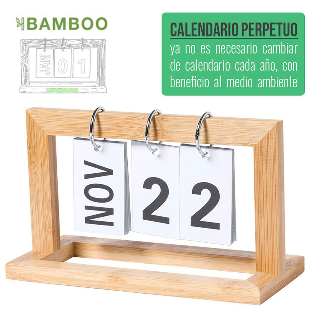 Calendario perpetuo de línea nature: ya no es necesario cambiar de calendario cada año, con el beneficio al medio ambiente que esto supone. Fabricado en bambú, con anillas metálicas cromadas. Tipografía de fácil lectura y especialmente diseñado para marcaje en láser. Dimensiones 12 x 20 x 9 cm.