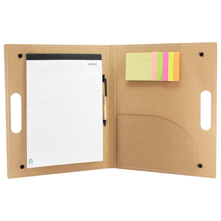 Carpeta Ecológica tipo Maletín, en cartulina reciclada, con broches. Incluye Block Lineado A4 20 hojas, 1 taco notas adhesivas de 25 hojas de 7,6 x 7,6 cm + 5 tacos de 25 banderitas adhesivas de 7,6 x 1,5 cm., bolsillo interior y 1 bolígrafo ecológico.