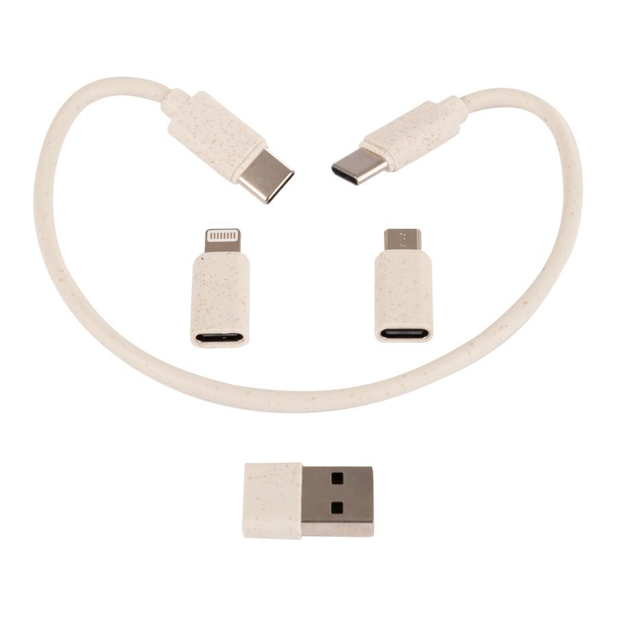 Connect Multicargador 6 en 1, con cuerpo redondo de madera de bamboo con tapa imantada + cables y conectores en fibra de Trigo. Contiene 1 cable con 2 terminales tipo C, 1 adaptador tipo C a i-phone (lightning), 1 adapatador tipo C a Micro USB y 1 adaptador tipo C a USB, todos dentro de cuna de EVA gris. Incluye un lanyard tipo cuerda de nylon gris de 15 cm. de largo. Presentación en bolsa 100% compostable + caja de regalo en cartón color natural.