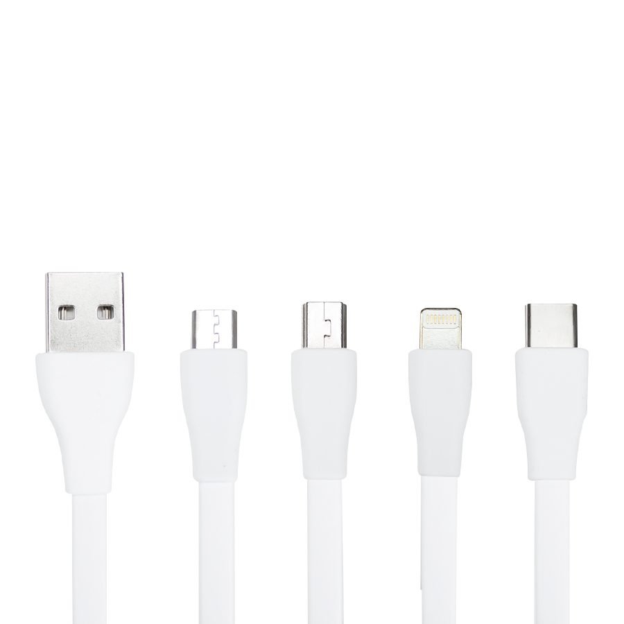 Connect Multicargador 5-en-1 con cables plásticos TPE engomado blanco y base plástica ABS blanco con mosquetón. Multi-cables con terminales de carga USB / Micro USB / Mini USB / Lightning / Type C. Compatible con dispositivos Android, Apple y Type C. Presentación en elegante bolsa OPP con orificio para colgador de ganchera. Producto con aprobación CE, ROHS, FC.