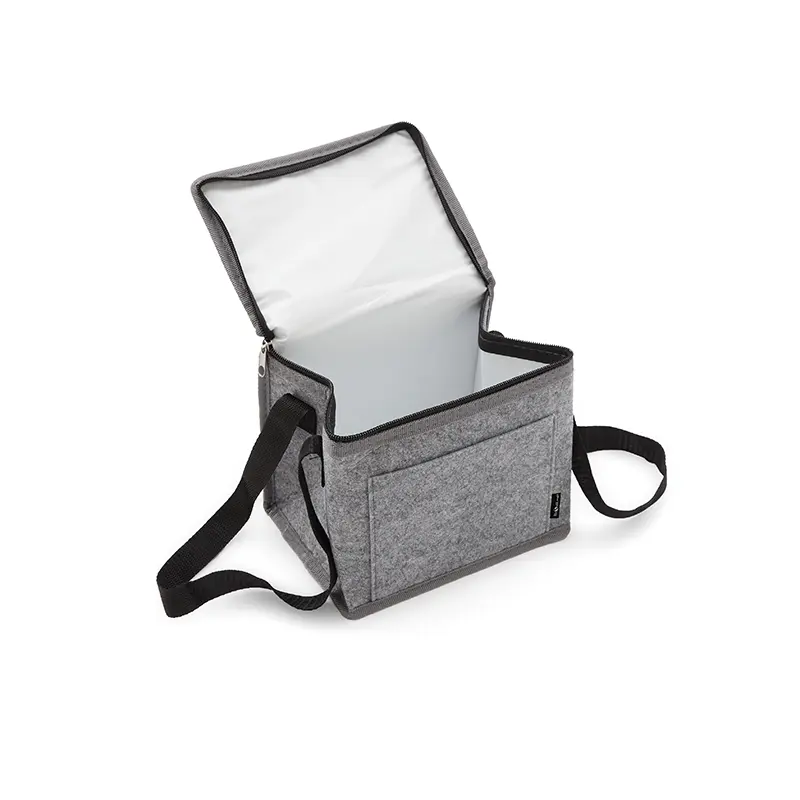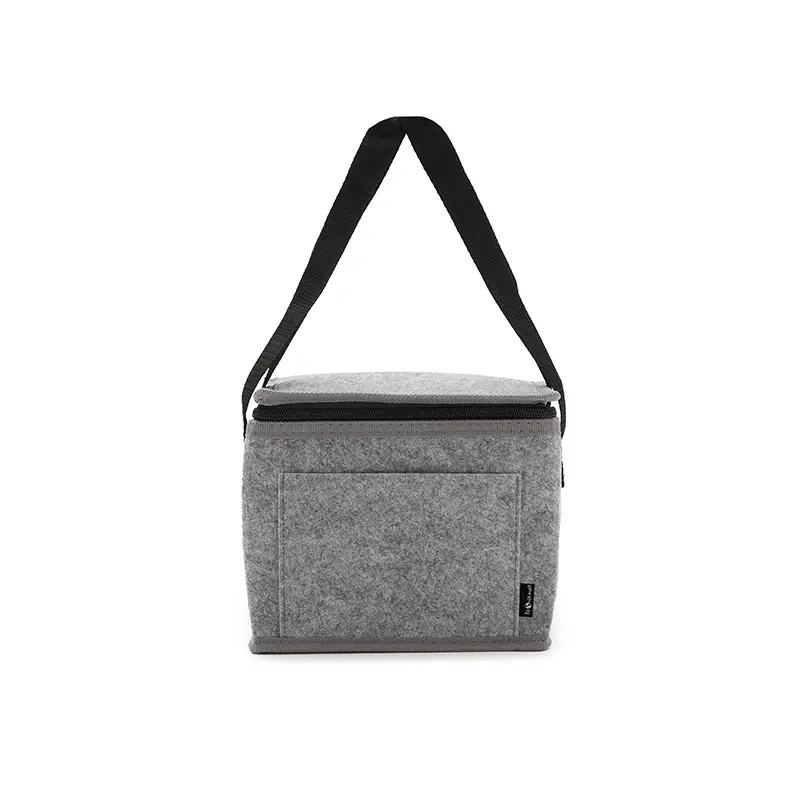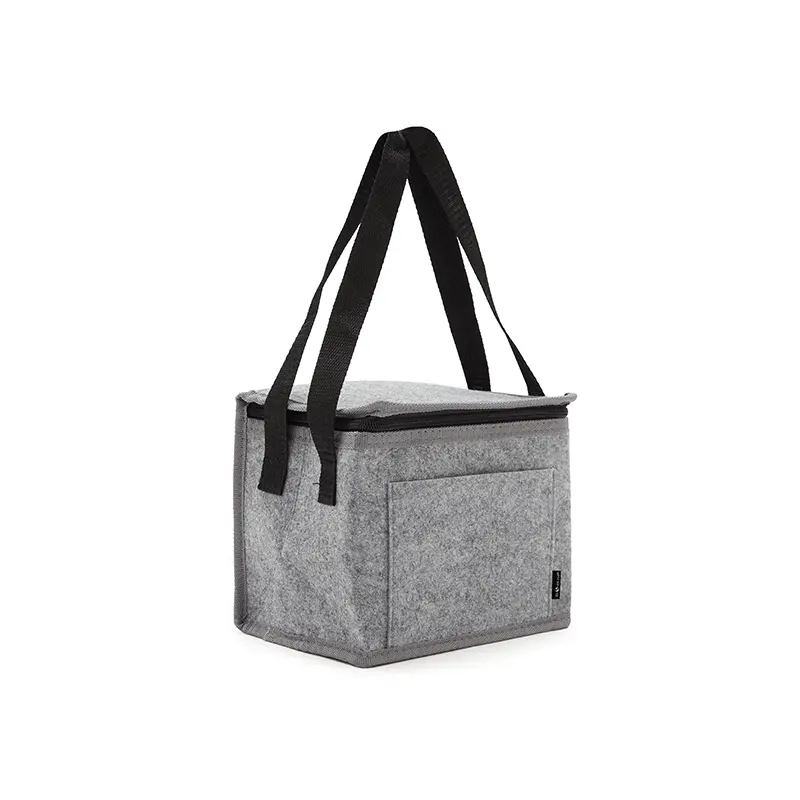 Cooler fabricado en fieltro de RPET, confeccionada a partir de botellas recicladas, con 2mm de espuma de polietileno laminado con película de aluminio. Ideal para transportar comida y bebida, conservando el frío. Dimensiones: 20,5 x 18 x 15 cm. Capacidad 5L. Reuseme.