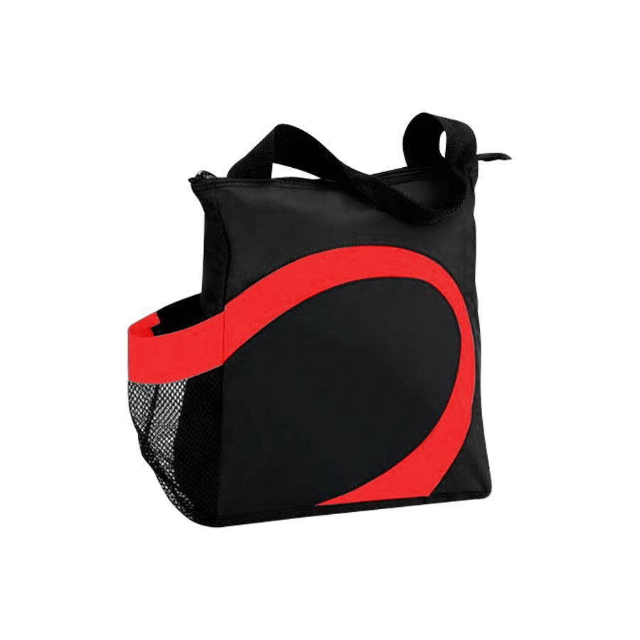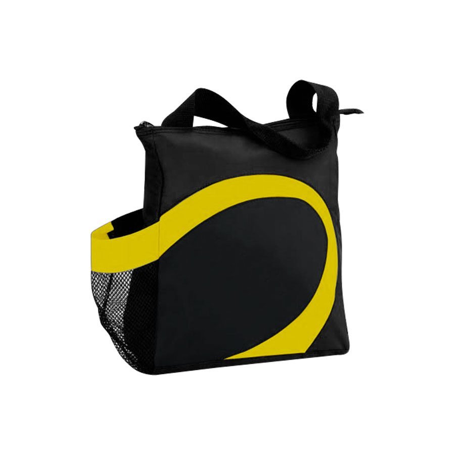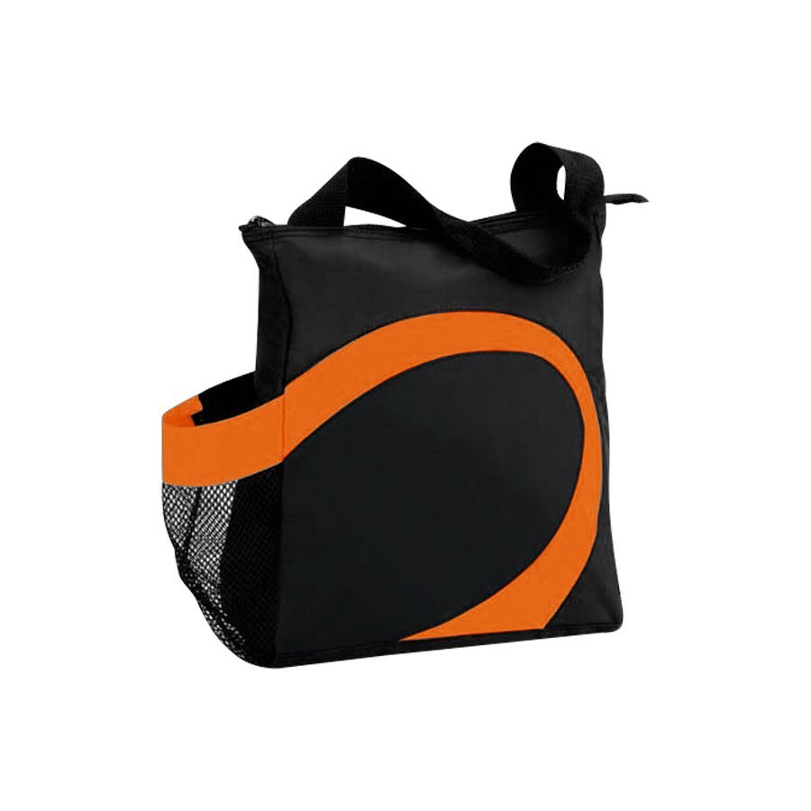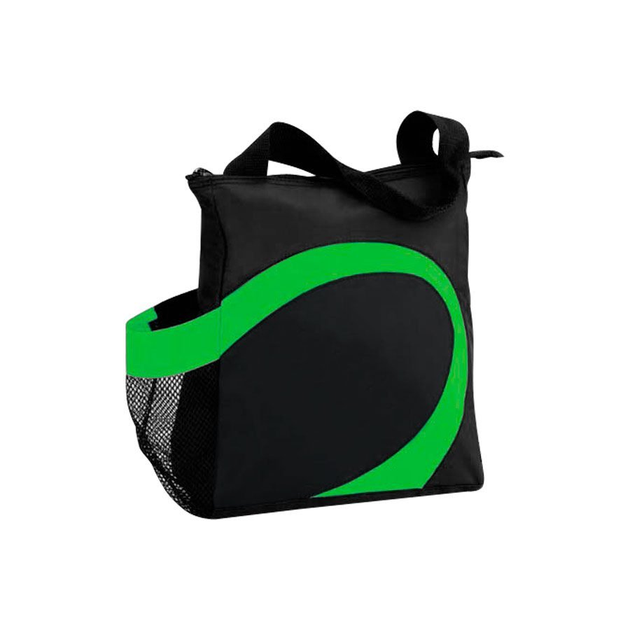 Cooler modelo «Wave». Tela exterior Polyester 70D/PVC. Tela interior plateada aislante 15C PEVA + relleno 3mm esponja PE. Cierre cremallera superior. Incluye bolsillo lateral en tela malla.