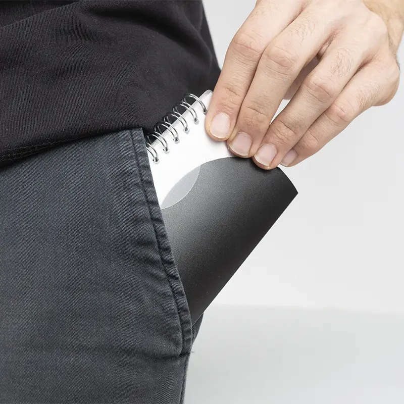 Cuaderno anillado con tapa de PP y 60 hojas rayadas. Medidas 10,8 cm x 7,8 cm.