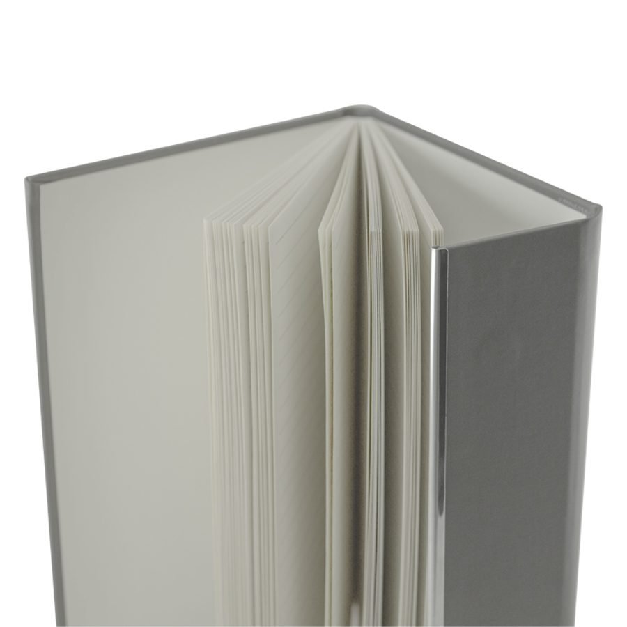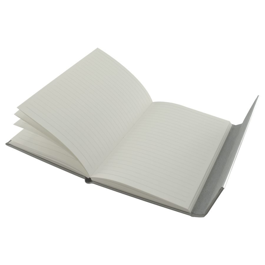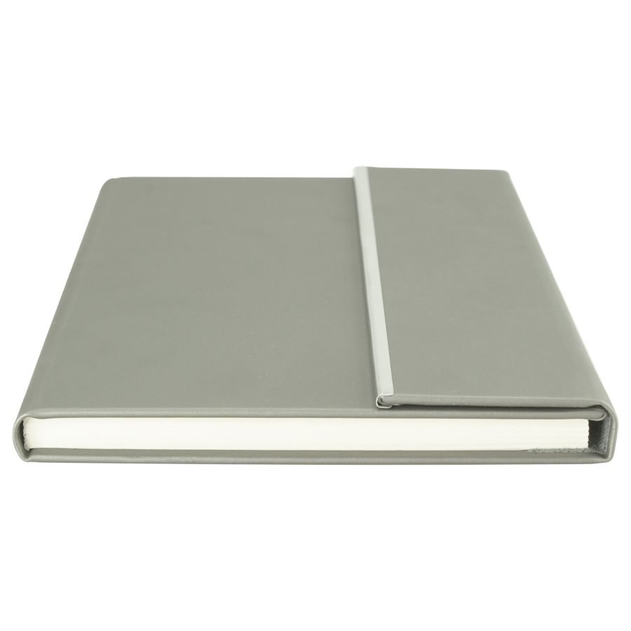 Cuaderno tamaño A5, cubierta de Termo-PU gris, con cierre traslape magnético y banda metálica plateada. Interior 80 hojas lineadas amarillas de 80gsm. Presentación individual en bolsa de polipropileno.