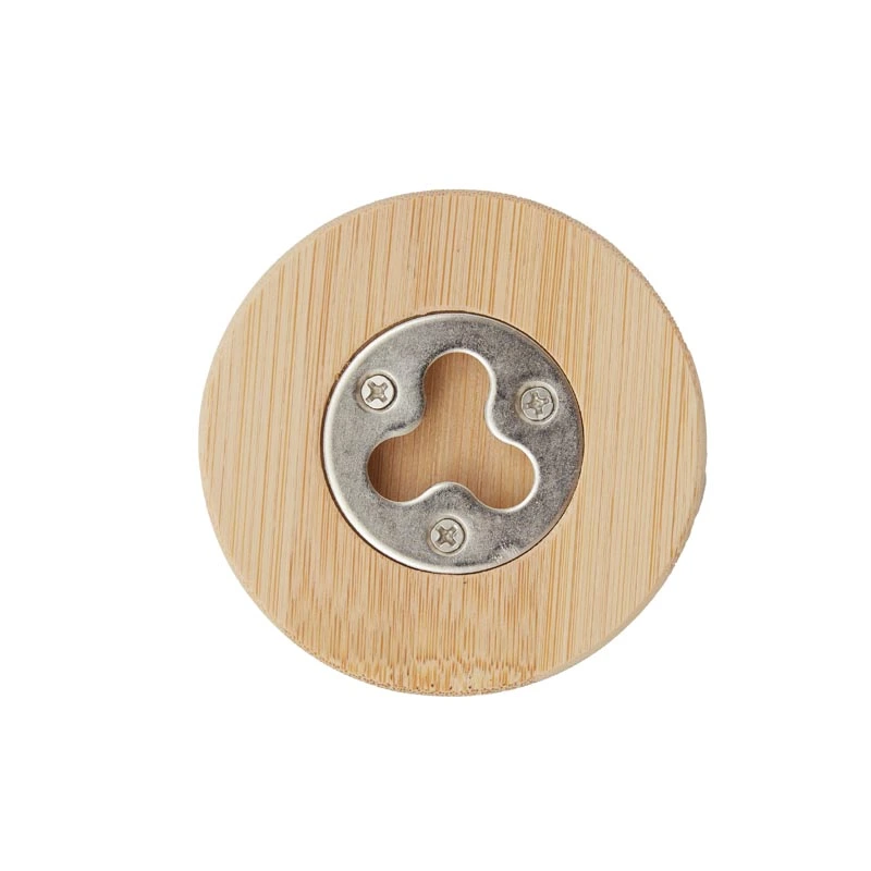 Destapador abrebotellas circular fabricado en bambú y metal. Dimensiones: 6 cm. ReUseMe