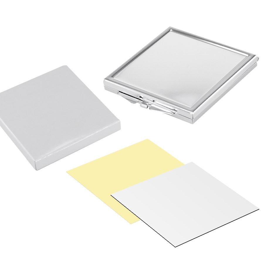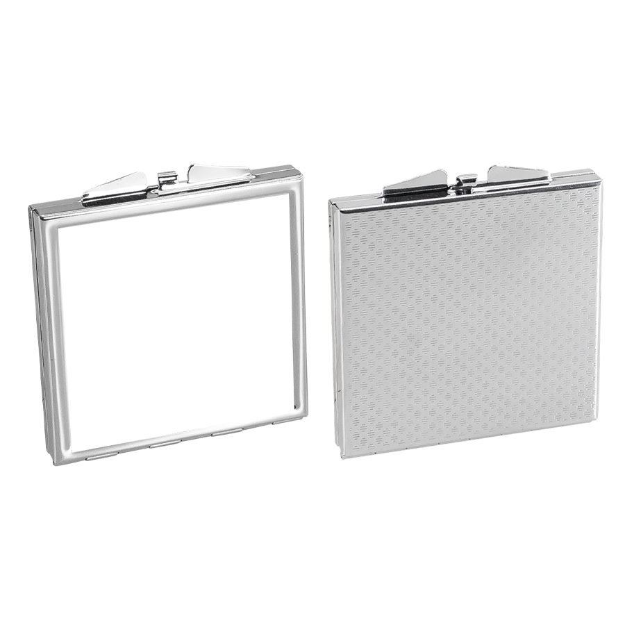 Espejo metálico cuadrado doble, con tapa, con cuadrado para Sublimación. Presentación en caja laminada blanca.
