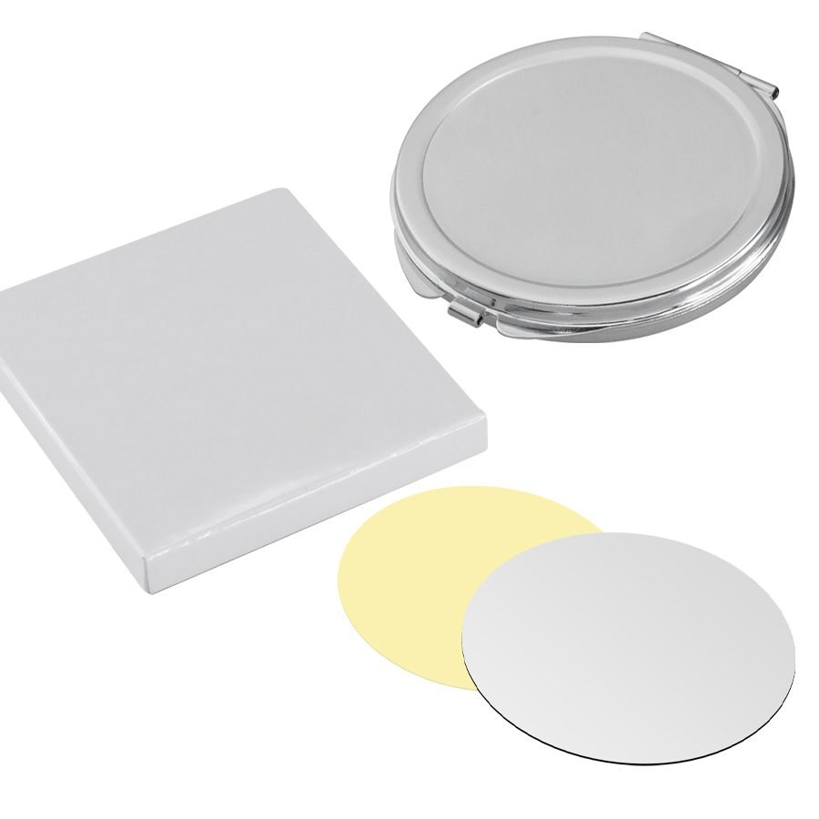 Espejo metálico redondo doble, con tapa, con círculo para Sublimación. Presentación en caja laminada blanca.