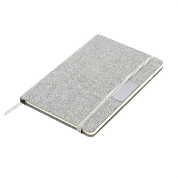 Sostenibilidad elegante.Libreta con placa metálica. Tapa de cartón de 300g recubierta en RPET 310. Placa metálica de 5 x 2 cm. Interior de 80 hojas rayadas en papel obra de 70g. Encuadernación cosida. Cierre con banda elástica del mismo color de la tapa.Medidas: 14 x 21 x 1,5 cm.