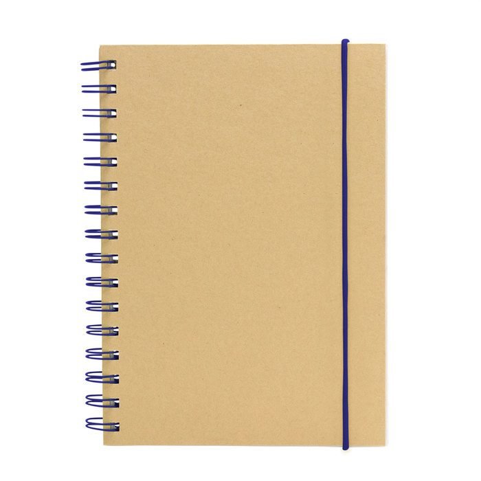 21 x 14,7 cm. Cartón y Papel. Libreta espiralada. Tapa recubierta en papel kraft de 120 g. Interior de 70 hojas blancas rayadas de 80 g. Cierre con banda elástica y espiral del mismo color.
