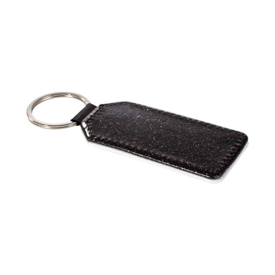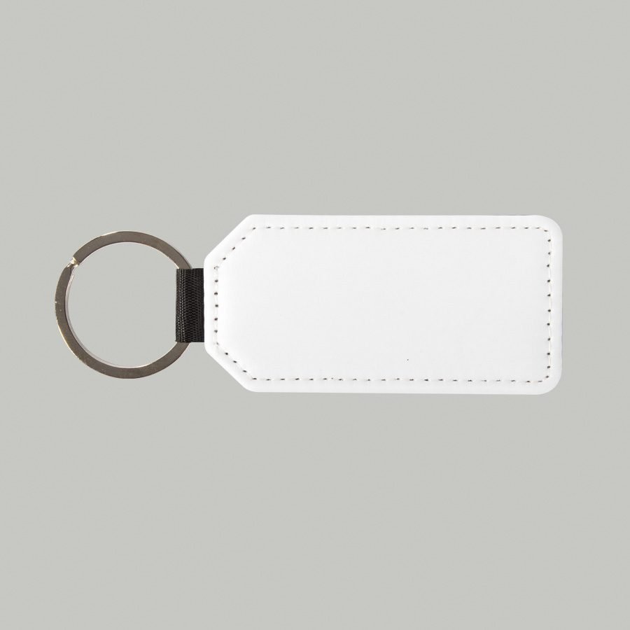 Llavero rectangular con forma «bandera» de PU blanco para sublimación. Reverso capa PU negro con brillo (no sublimable). Argolla de Acero inoxidable.