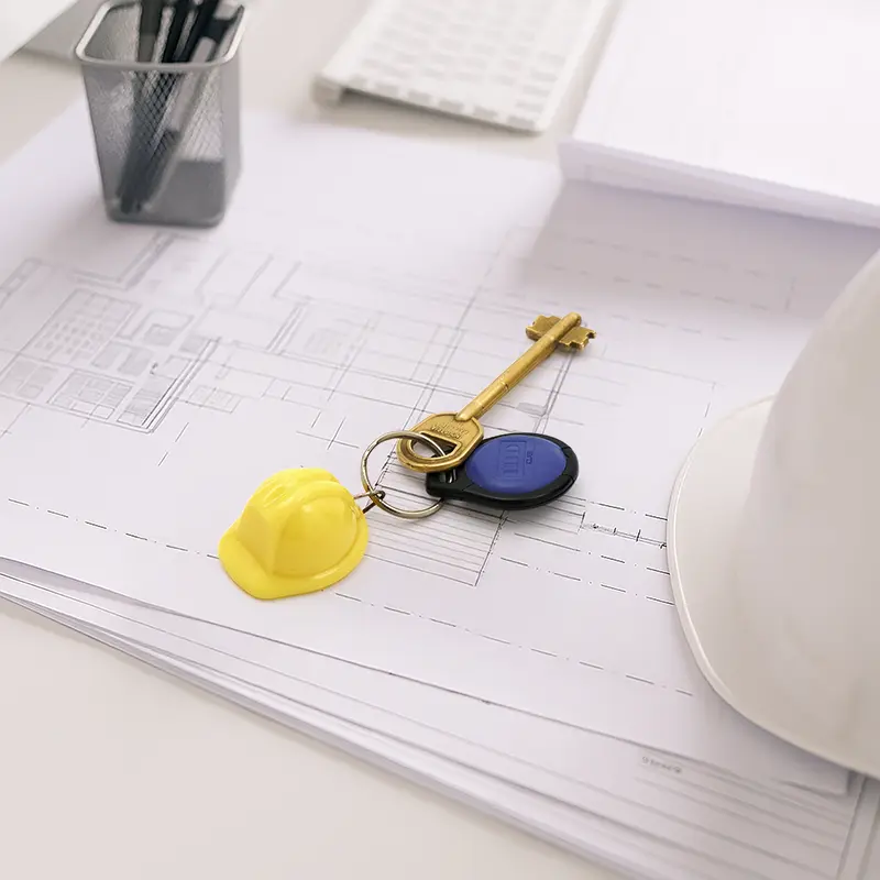 Llavero con forma de casco. Hecho de plástico ABS y anillo metálico de hierro. Cuenta con diseño en miniatura de casco de seguridad, anillo resistente para llaves y variedad de colores. Es ideal para identificar llaves con un toque original o regalar en eventos vinculados a la construcción o seguridad industrial.