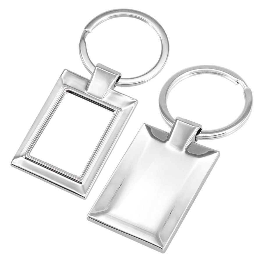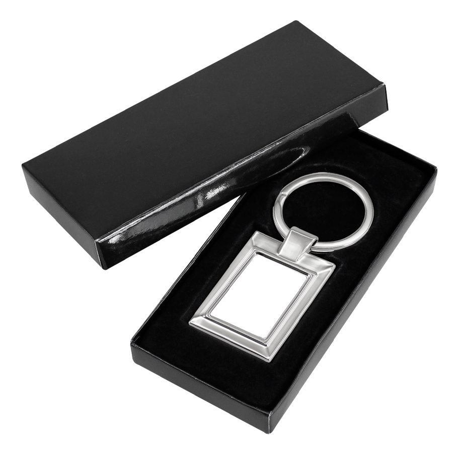 Llavero metálico rectangular, con rectángulo blanco para sublimación. Presentación en estuche laminado negro con cuna aterciopelada.