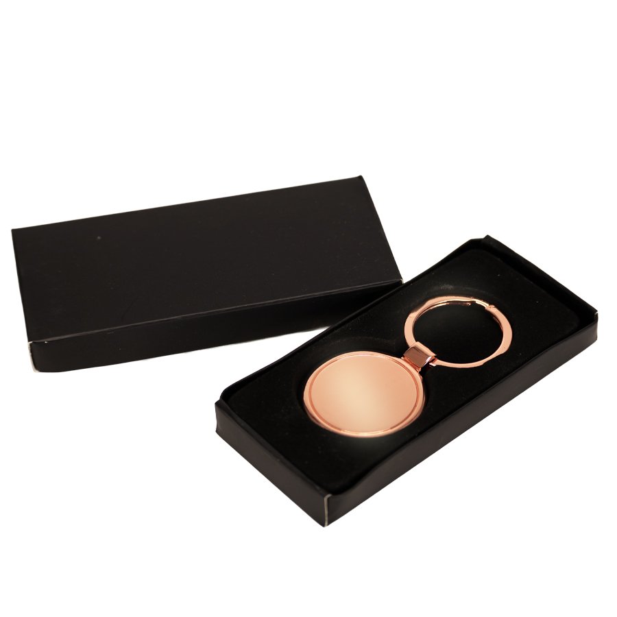 Llavero metálico redondo de zinc alloy encobrizado. Presentación en elegante estuche laminado negro mate, con cuna aterciopelada negra.