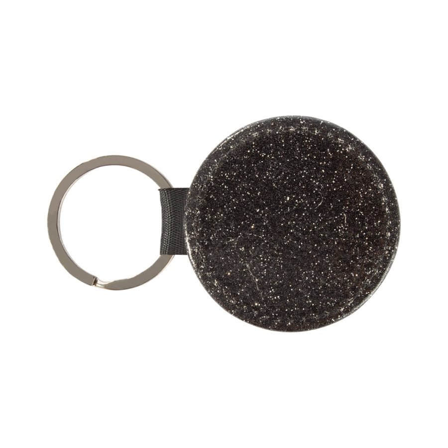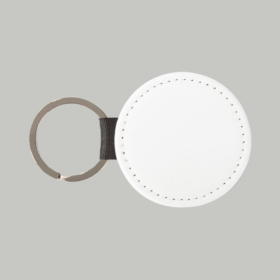 Llavero redondo de PU blanco para sublimación. Reverso capa PU negro con brillo (no sublimable). Argolla de Acero inoxidable.