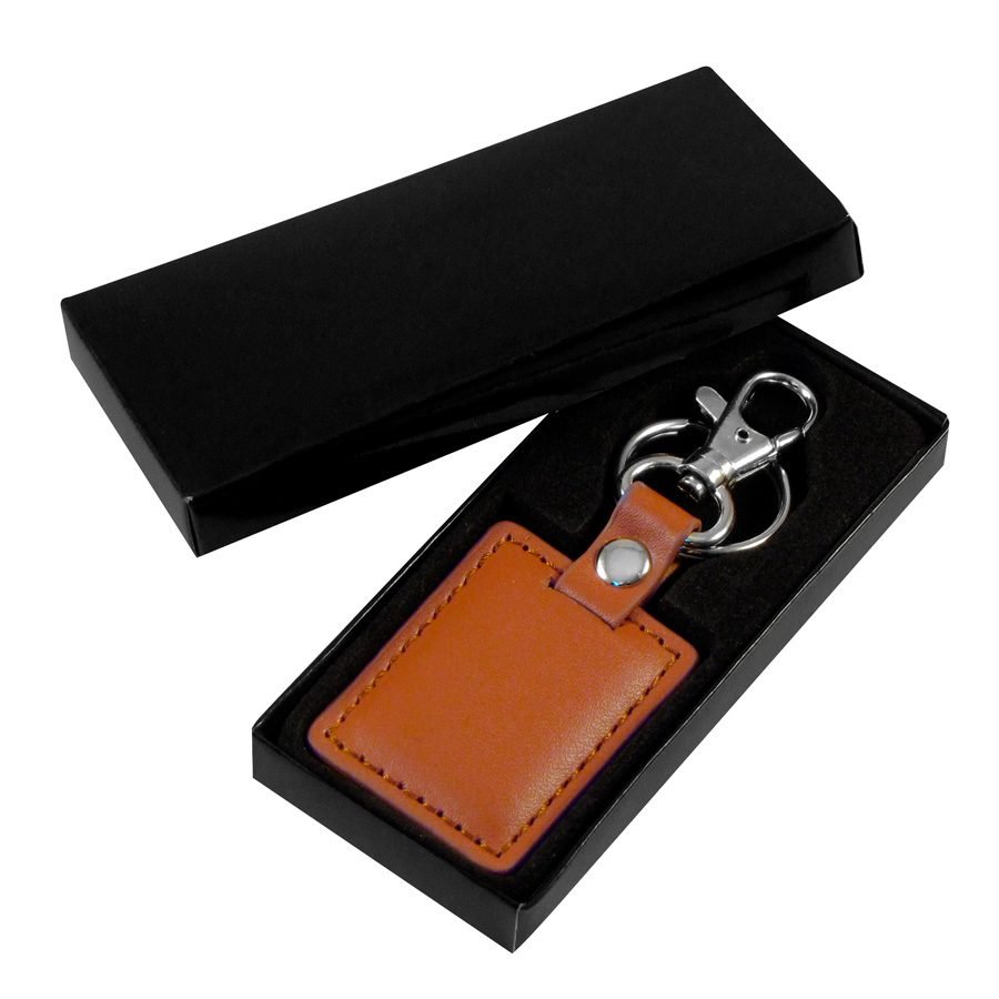 Llavero de simil Cuero Café + Mosquetón Metálico. Presentación en estuche laminado negro con cuna aterciopelada.