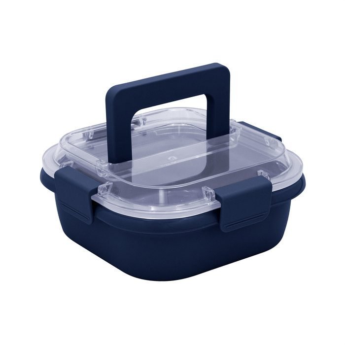 17,8 x 17,8 x 7,6 cm. Capacidad 1 litro. Plástico PP. Contenedor de alimentos. Tapa translúcida con cuatro clips de cierre hermético y asa para trasladar cómodamente. Clips y asa del mismo color que el recipiente.