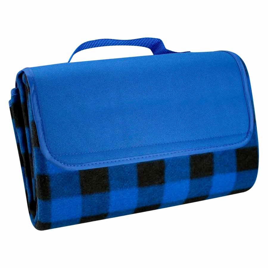 Manta de Polar 160g diseño cuadriculado con acolchado de esponja. Reverso impermeable de PE negro. Incluye solapa de poliéster 600D para logo, con mango.