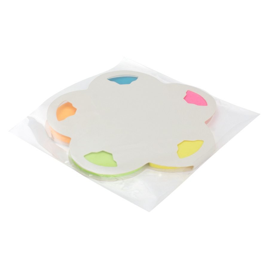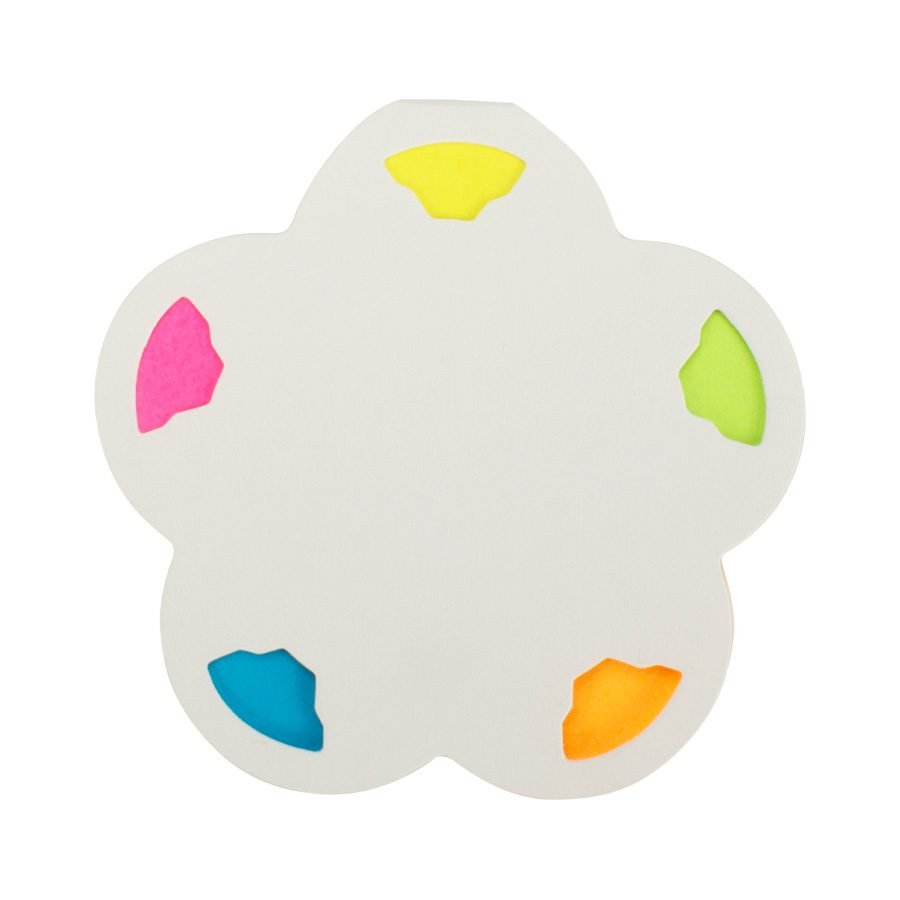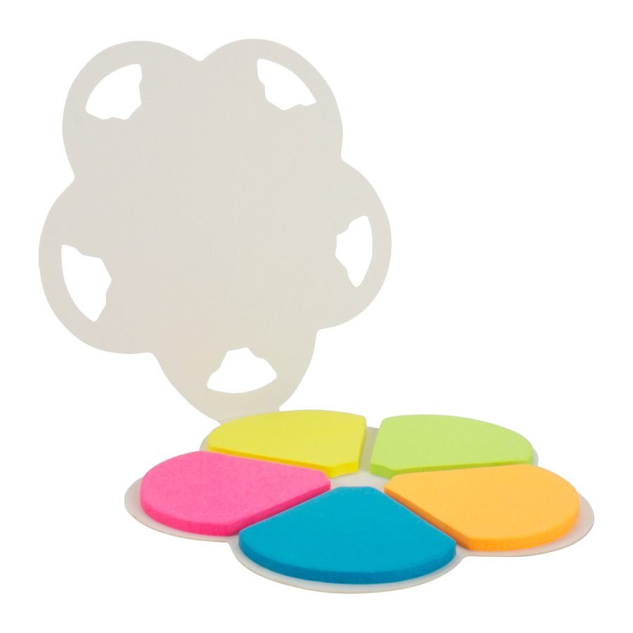 Memo set Ecológico con tapa y contra-tapa de cartulina blanca reciclada. Incluye 150 banderitas adhesivas de colores con forma de pétalo de flor.