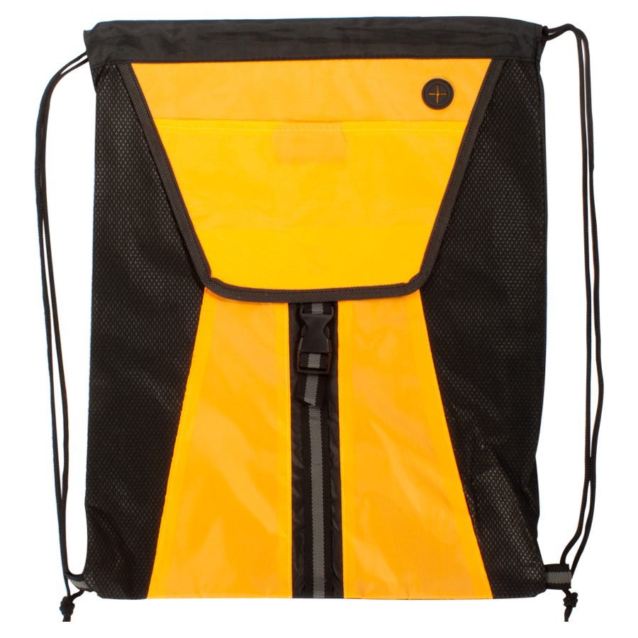 Mochila bicolor tipo Morral modelo «Studio» de poliéster 210D/PU y tela TNT, con bolsillo delantero y tiras de cordón negro.