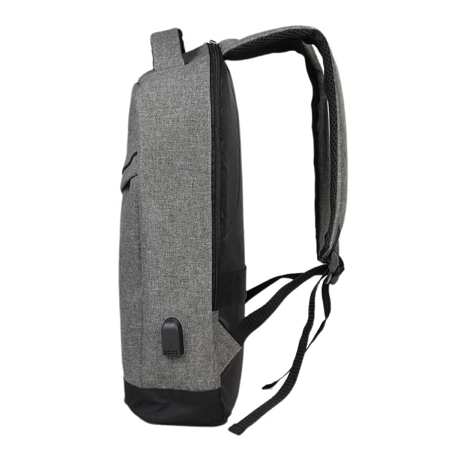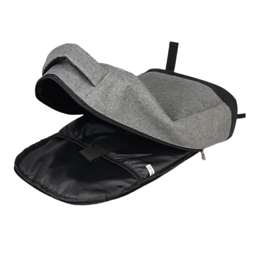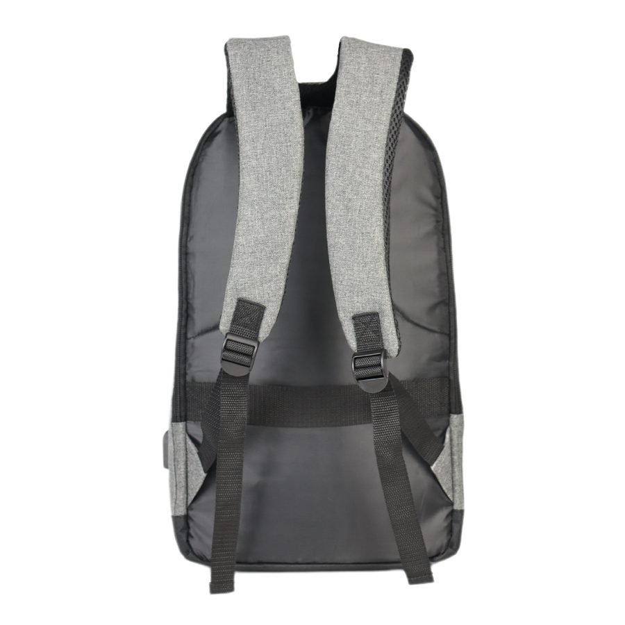 Mochila Porta-Notebook modelo «TECH». Fabricada en poliéster 600D/PVC bitono y PU 210D. Capacidad 14 litros, tamaño 26.5 x 44 x 12 cm. Incluye compartimento interior reforzado y acolchado para Laptop, bolsillo delantero y terminal de salida para cable USB.