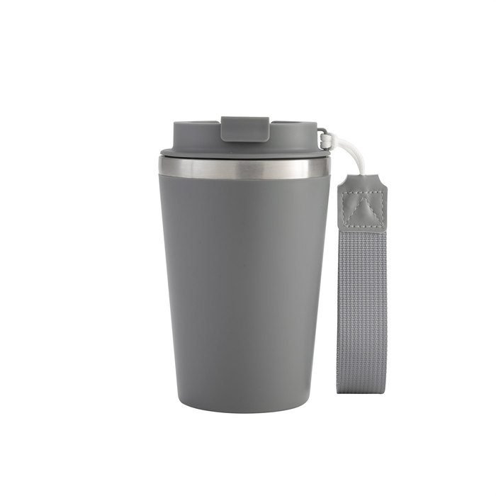 Perfecto para llevar en el día a día.Mug doble pared con asa colgante. Interior de acero inoxidable 304 y exterior de Polipropileno con acabado mate. Tapa a rosca de polipropileno con anillo de silicona y seguro antiderrame del mismo color del mug. Asa de poliuretano y poliéster.Medidas:  8,9 cm x 15 cm.