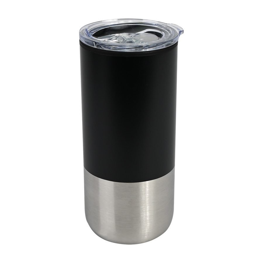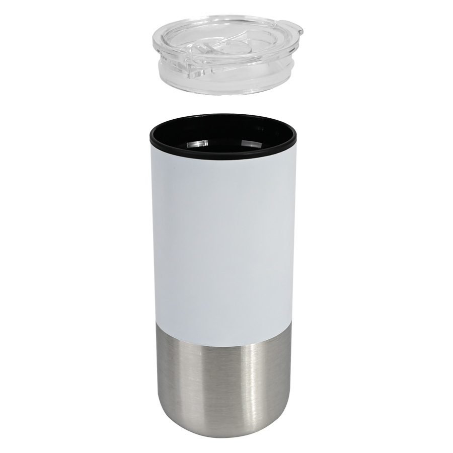 Mug metálico bicolor doble pared aislante, interior plástico PP, exterior plástico PP con pintura POWDER COAT, combinado con Acero inoxidable 201 SS, modelo «THEO». Producto BPA FREE, para el contacto con líquidos y alimentos. Fondo de silicona negra ABS anti-deslizante. Tapa removible de plástico PS Crystal Clear con sello cilíndrico de silicona. Capacidad 450ml. Presentación en bolsa PP + caja de regalo de cartón negro.