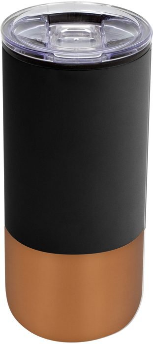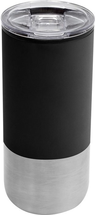Ø 8 cm X 17.6 cm. Capacidad 500 ml. Polipropileno y acero inoxidable. Mug doble pared. Interior en plástico y exterior de acero inoxidable 201. Tapa transparente a presión con boquilla y seguro antivuelco. Base antideslizante. Presentación en caja de regalo.