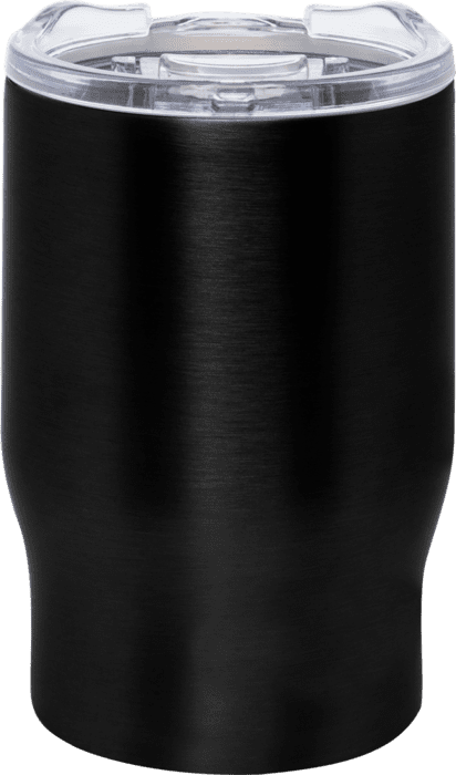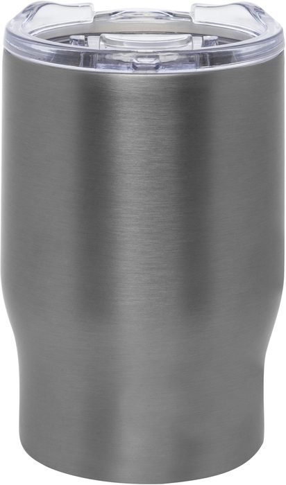 Ø 8,5 x 13,3 cm. Capacidad 350 ml. Acero inoxidable. Mug doble pared. Interior de acero 304 y exterior de acero 201. Tapa plástica transparente a rosca con cierre anti derrame. Mantienen las bebidas frías y calientes por más tiempo. No utilizar con bebidas gaseosas. Presentación en caja de regalo.