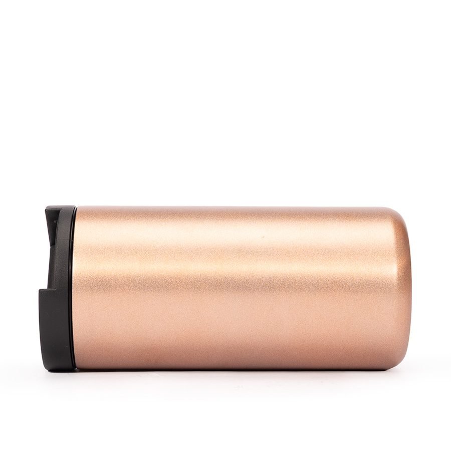 Mug metálico cilíndrico con doble pared aislante, interior Acero inoxidable 304 SS, exterior Acero inoxidable 201 SS, recubierto con pintura POWDER COAT color cobre. Producto BPA FREE, para el contacto con líquidos y alimentos. Fondo de silicona negra ABS anti-deslizante. Con tapa pull-up de plástico ABS negro y dosificador con sello cilíndrico de silicona. Capacidad 500ml. P