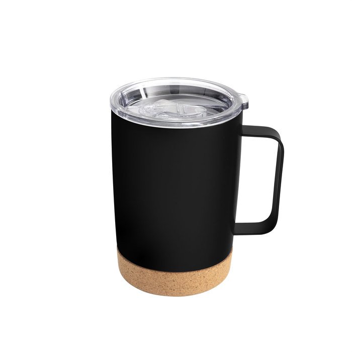 Diseño elegante con base de corcho.Mug doble pared con asa, sellado al vacío. Mug con aislamiento térmico. Tecnología vacuum. Interior en acero 304 y exterior en acero 201. Tapa de poliestireno con anillo de silicona. Asa metálica. Base de corcho. Pintura acabado semi mate. Mantiene hasta 12 hs la temperatura de las bebidas calientes y 24 hs de las bebidas frías.Medidas: 8,5 cm x 13 cm. (no incluye asa)