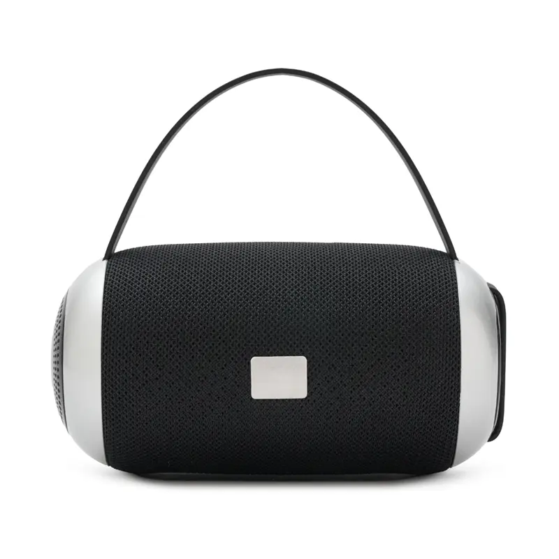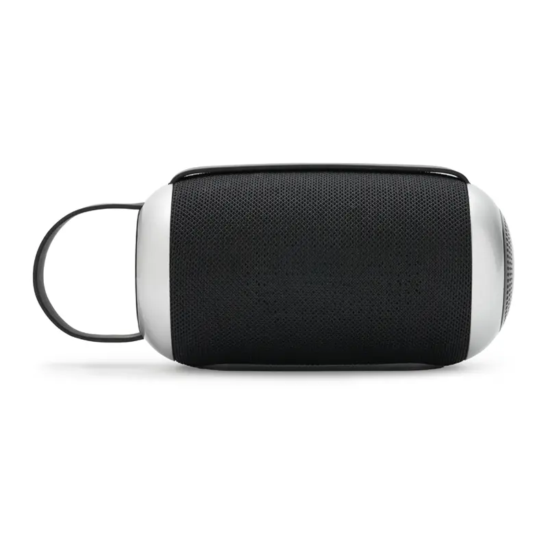 Parlante portátil Bluetooth de color negro con detalles en gris. Cuenta con una correa de agarre y una base que proporciona un mejor apoyo y estabilidad al usarlo en diversas superficies.