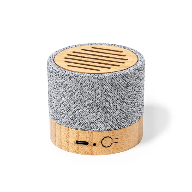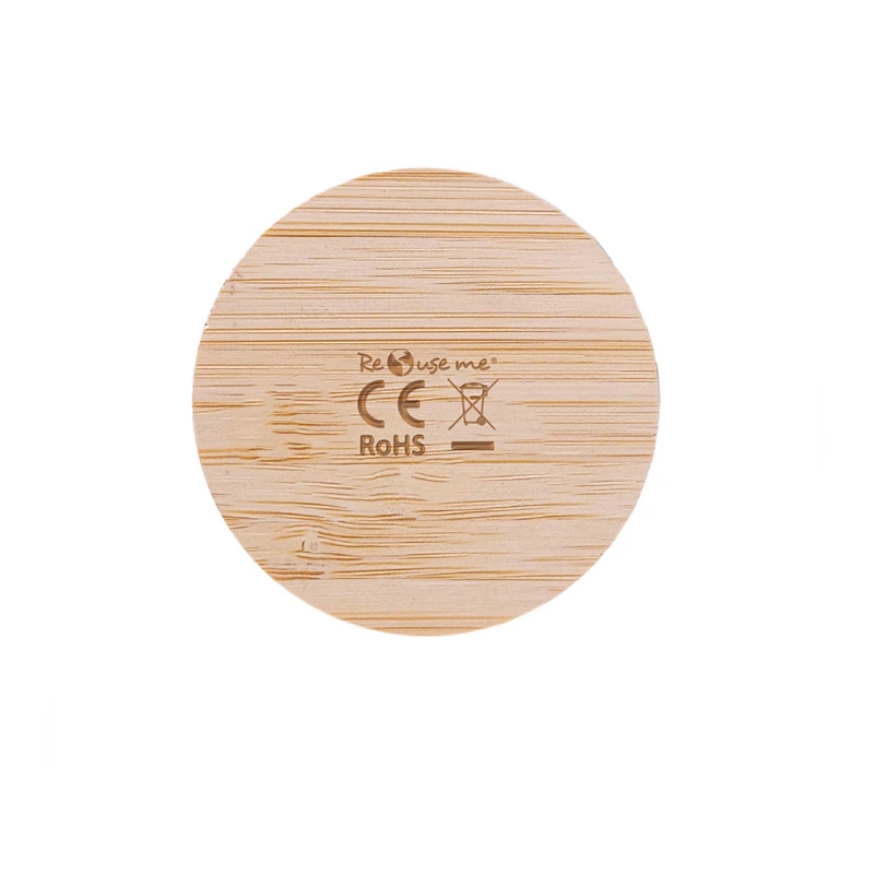 Parlante portátil fabricado en bambú y RPET. Tiene tecnología Bluetooth 5.0 y una batería de 300 mAh. Ofrece de 2 a 4 horas de reproducción con una carga de 2.5 horas. El parlante viene en una bolsa 100% compostable dentro de una caja de cartón junto a su manual de instrucciones y cable cargador. Dimensiones: 5,4 x 6,05 cm. Reuseme.