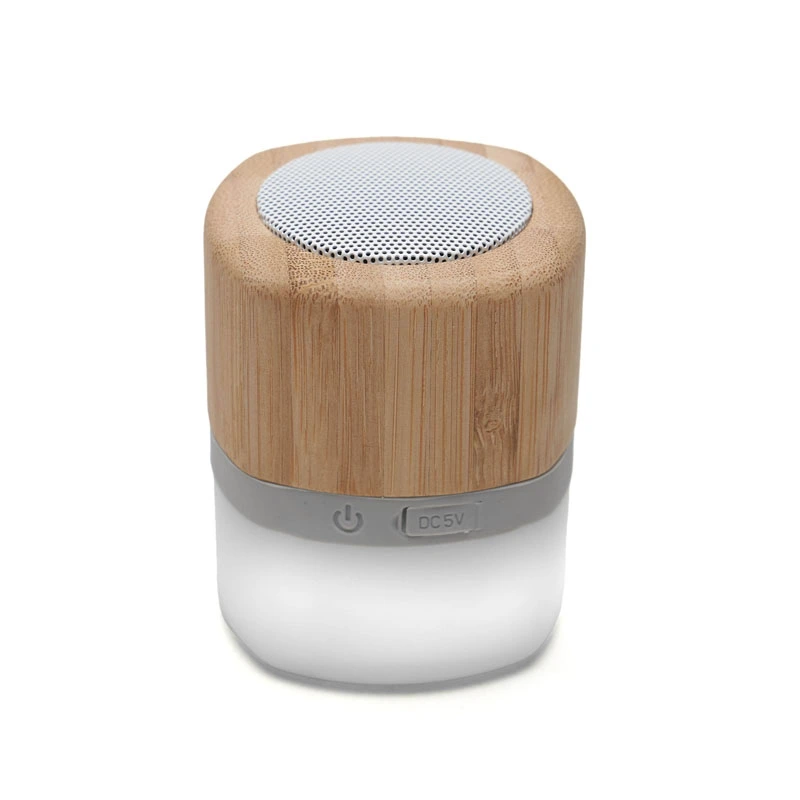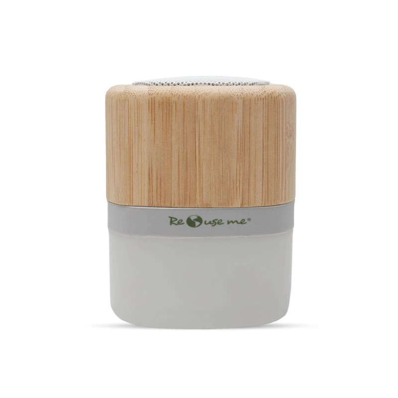 Parlante portátil con tecnología Bluetooth. Realizado en combinación de ABS con Silicona y bamboo, con iluminación en la base. Características técnicas: Batería de 300mAh | Poder del parlante: 3W | Frecuencia: 200Hz-20KHz | Conexión: 5V / 500mA | Distancia de alcance: 10 Metros | Peso 150gr | Medidas: 6 x 6 x 7,5 cm. ReUseMe. Incluye Gift Box confeccionada en cartulina Kraft.