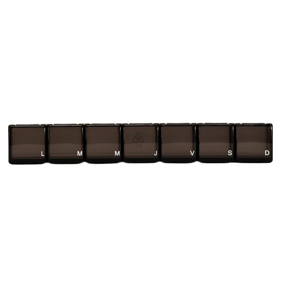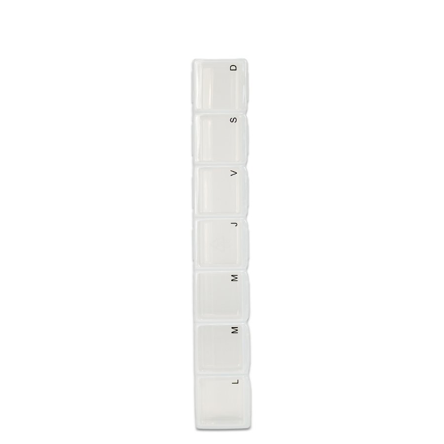 Pastillero Plástico de PVC «TREN», con 7 compartimentos interiores, identificados y ordenados con las iniciales de los 7 días de la semana. Presentación el bolsa blanca biodegradable + caja de cartulina blanca.