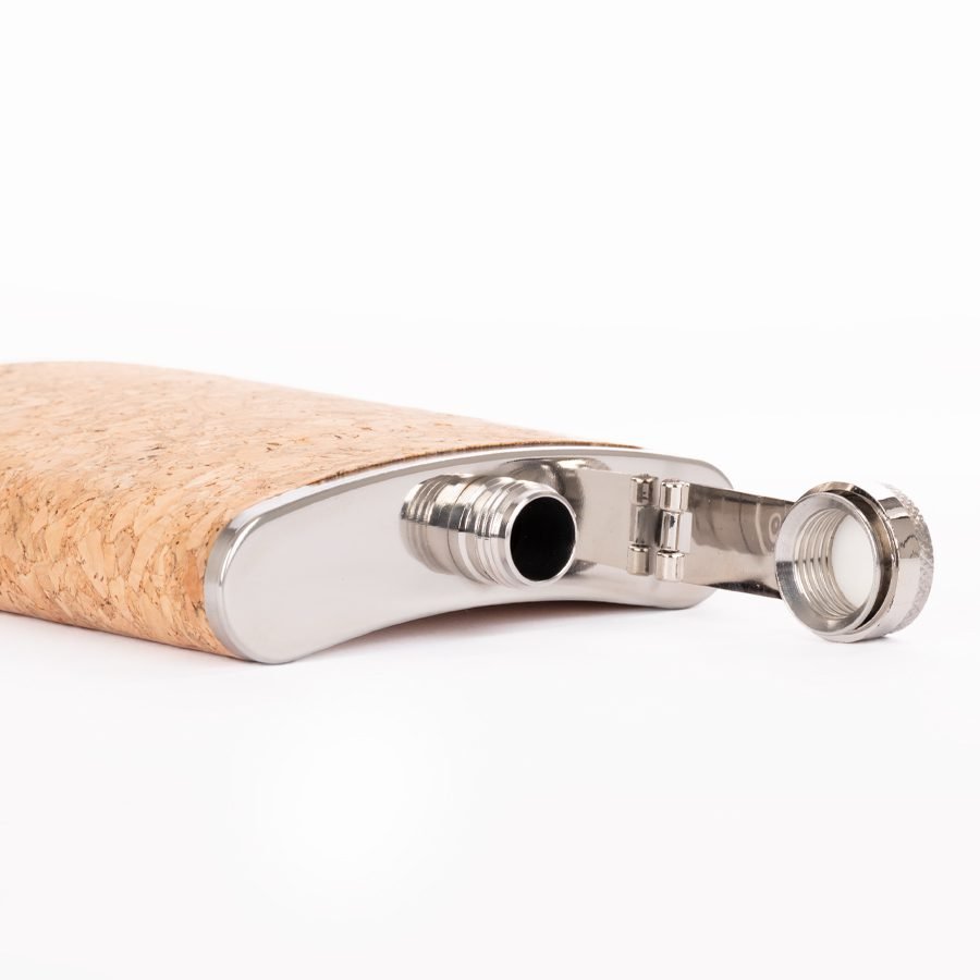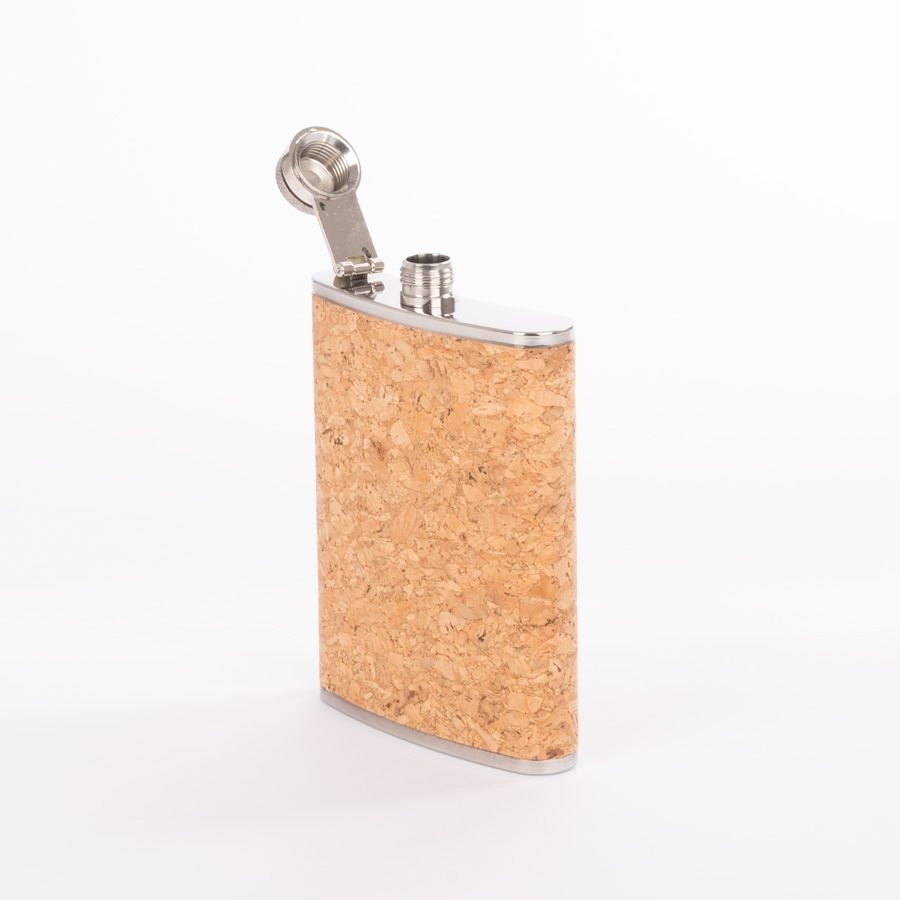 Petaca Licorera de Acero Inoxidable SS304, modelo «CORK», con cubierta de corcho natural. Capacidad 8 oz (237 ml). Presentación en bolsa OPP transparente + caja de cartulina negra.