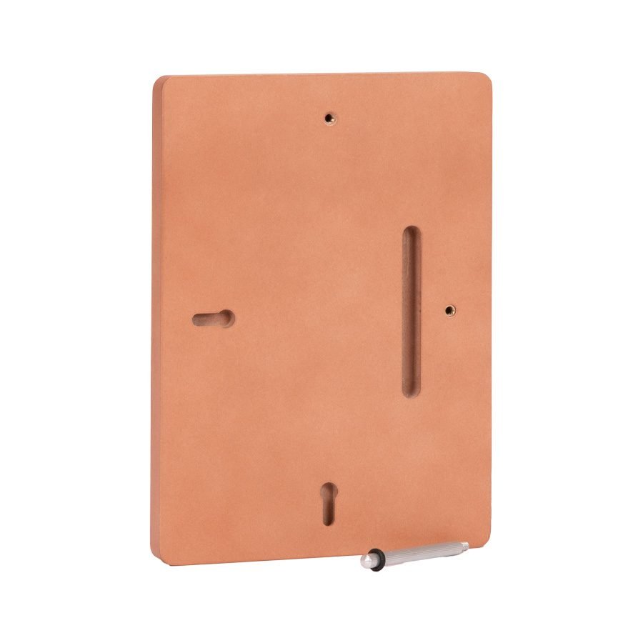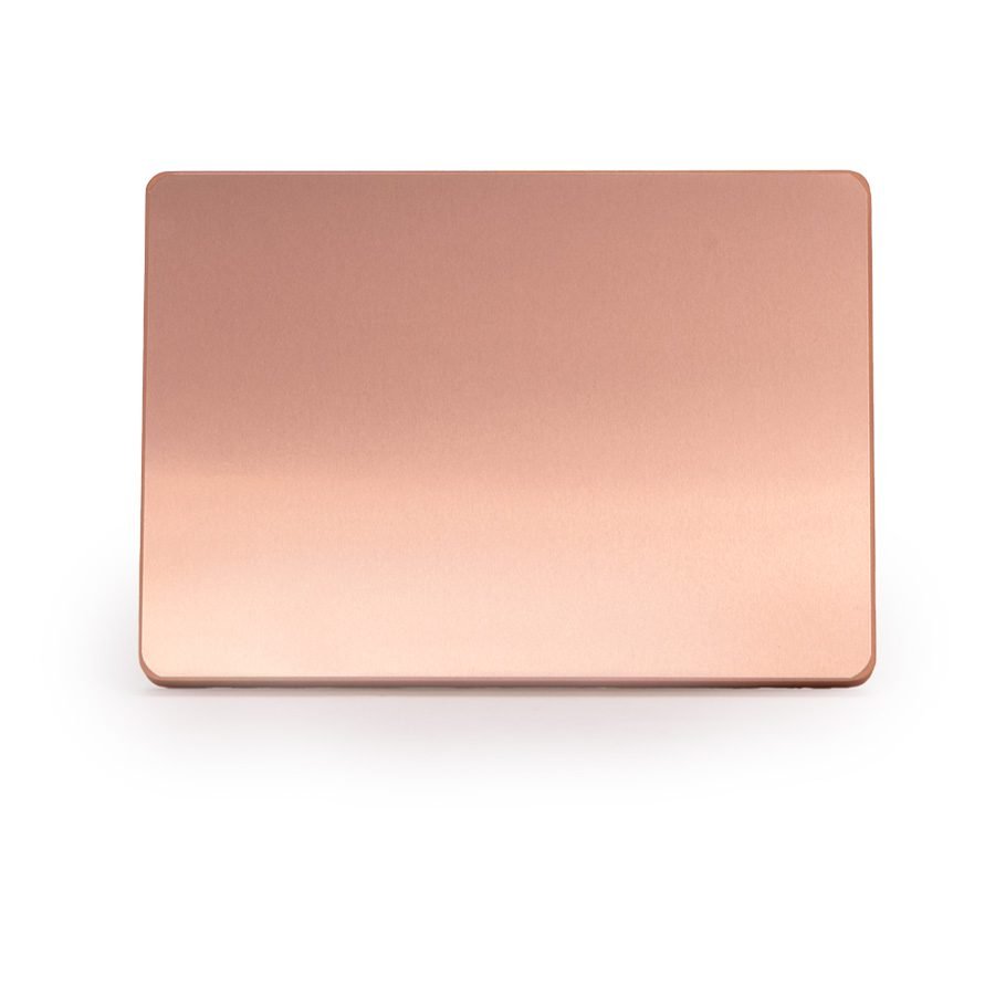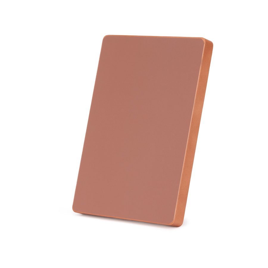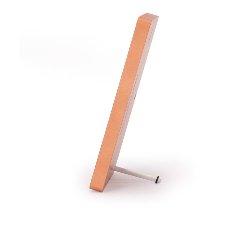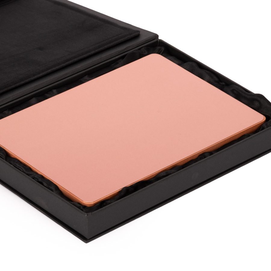 Placa metálica color cobre, modelo BLOCK, montada sobre base rectangular de madera enchapada con esquinas redondeadas. En su parte posterior, incluye orificios y soporte metálico para exhibición vertical u horizontal. Presentación en caja de cartón forrado negro con cierre imantado, interior acolchado de espuma y tela poliéster satinado negro, con troquel.