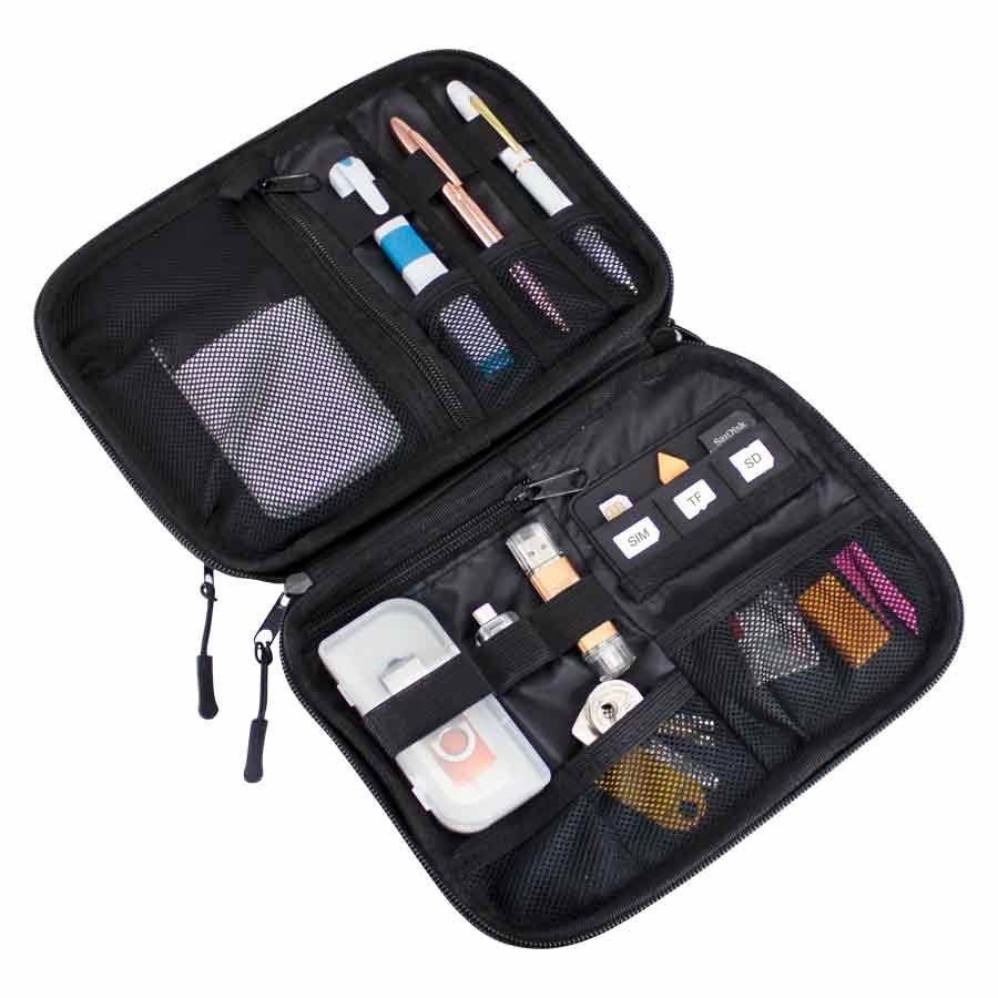 Bolso Porta-Accesorios de Viaje, en tela Polyester 840D. Gran cantidad de bolsillos y compartimentos para accesorios, bolígrafos, tarjetas de memoria, etc. Con gancho de tela para colgar. Un bolso práctico y pequeño, ideal para llevar dentro de tu equipaje de mano.