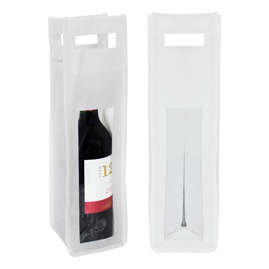Porta-Botella de vino, para 1 unidad, en tela no tejida (TNT) de 80g/m2, con ventana frontal de PVC clear.