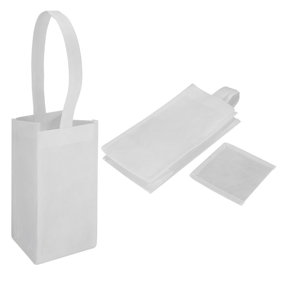 Porta-Botella de vino, para 1 unidad, en tela PET no tejida de 100g/m2. Cuenta con una manilla de 42cm. aprox. Y base de cartón forrado en tela PET no tejida. Ideal para sublimación.