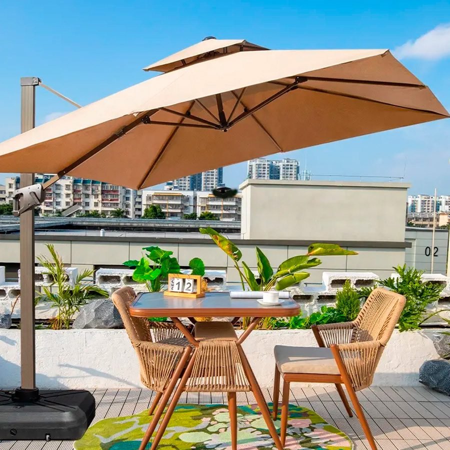 Quitasol lateral cuadrado de 3x3m, con 4 cascos de resistente lona Poliéster impermeable de 260g con protección UV. Contiene asta de Aluminio de 90x60mm x 2.50m de altura y 8 varas de aluminio. Sistema de apertura manual con regulación de altura y ángulo para sombra. Sistema manual de rotación 360°. Puedes usarlo en la noche! Cuenta con panel de carga solar y sistema de iluminación LED sectorizado, con interruptor.