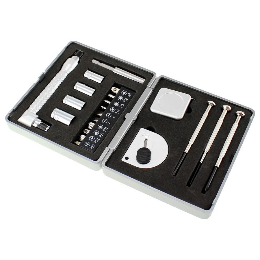 Set de 21 prácticas herramientas en caja rígida plástica plateada. Amplia área para impresión.