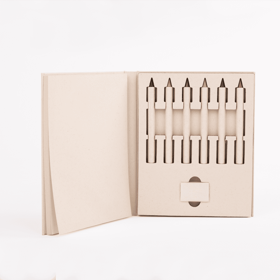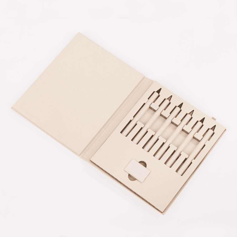 BALEARES es un set diseñado para inspirar creatividad consciente desde el primer trazo. Elaborado con cartón reciclado de envases lácteos, incluye una libreta de 50 hojas, una goma de borrar y 6 lápices sin tinta (inkless), ofreciendo una alternativa sustentable a los materiales escolares y de oficina tradicionales. El papel, con su característico tono blanco grisáceo, conserva la esencia natural del material reciclado, reflejando una estética honesta y responsable. BALEARES es ideal para marcas que desean transmitir un mensaje auténtico de innovación circular, promoviendo el uso de recursos recuperados como parte de un nuevo ciclo creativo.