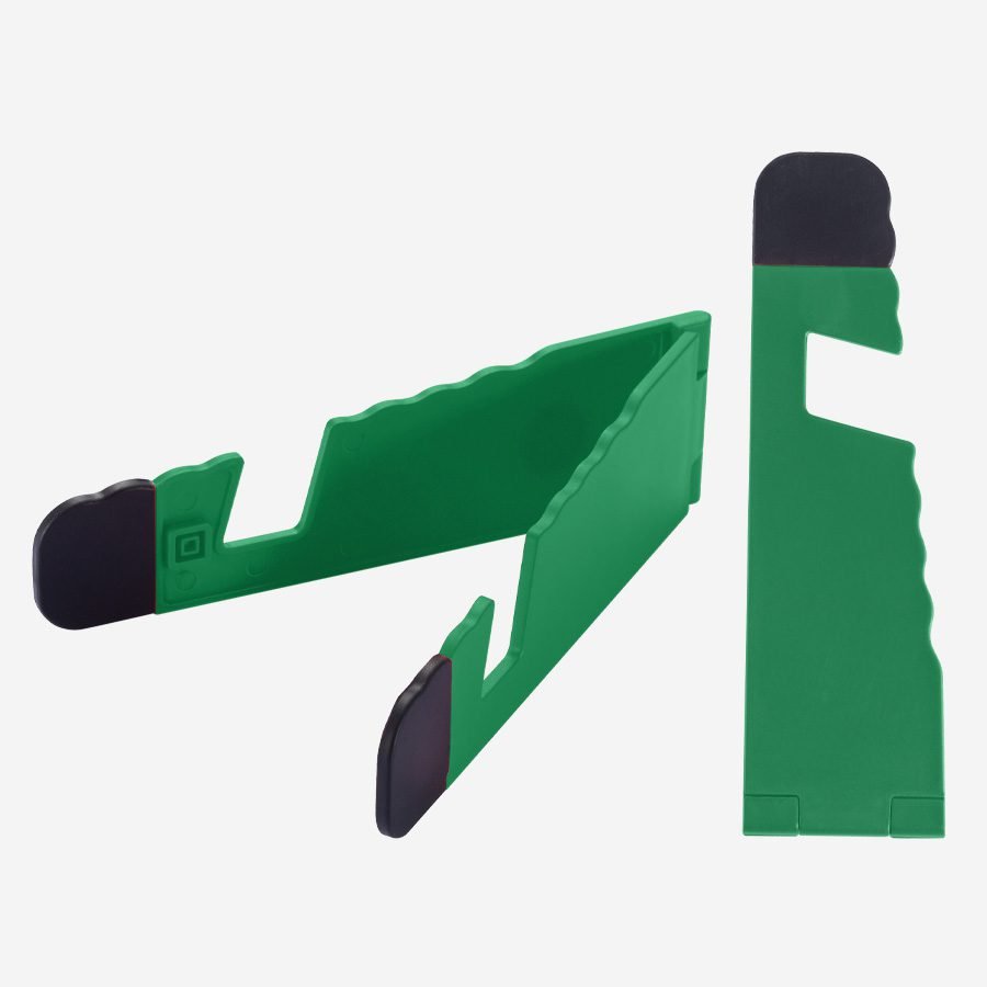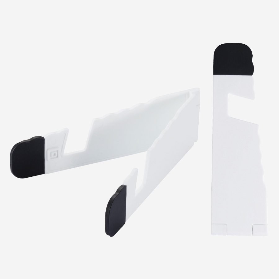 Soporte plástico abatible para iPad y Celular, con goma antideslizante en ambos terminales.